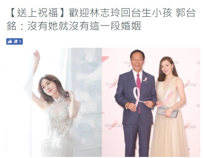 据报道,郭台铭在昨晚听说林志玲结婚的消息之后,第一时间是感到惊讶的,然后表示自己和太太都非常高兴,还称当初要是没有林志玲介绍,自己可能就没有今天的这一段婚姻。看来林志玲虽然最后没能和郭台铭走到一起,还给对方做了一次媒啊!