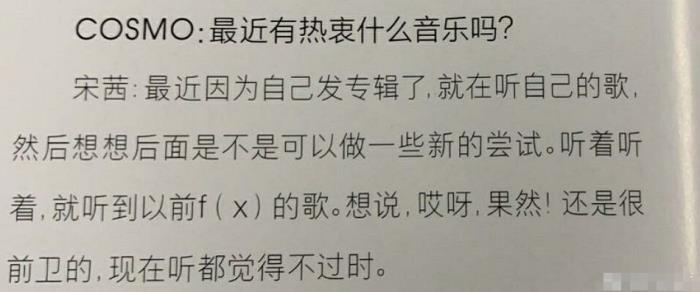 在2020年10月的《时尚cosmo》上宋茜的采访中,宋茜提到了f(x)。f(x)的歌曲很前卫这一点,是整个韩圈都公认的,音乐、舞蹈的风格都是超前卫的,很少能有别的团能够跳出感觉来。