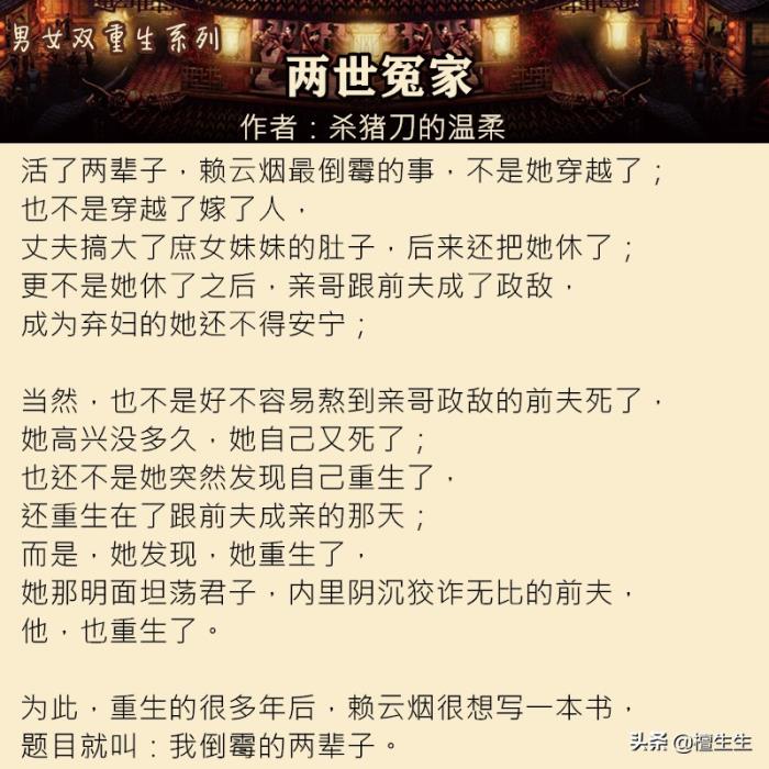短评:这本书非常烧脑,基调也相当沉重,男女主角前世是真的恨死双方,并老死不相往来。但在临终那一刻,男主感到极致空虚,也悔恨难当:纵使他权势滔天身居高位,美人云集、儿子(傻儿子一堆)满堂,可是那些人要的全是他能带来的荣华富贵,那个“结发为夫妻,相爱两不疑”,一心为他的原配却早已舍下他,并明里暗里捅他狠刀子,招招致他于死命!