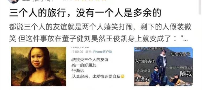“兄弟三人组”中,董子健沉稳,刘昊然逗趣,王俊凯负责“精致”。用网友的话说,就是“三个人的旅行,没有一个人是多余的。”