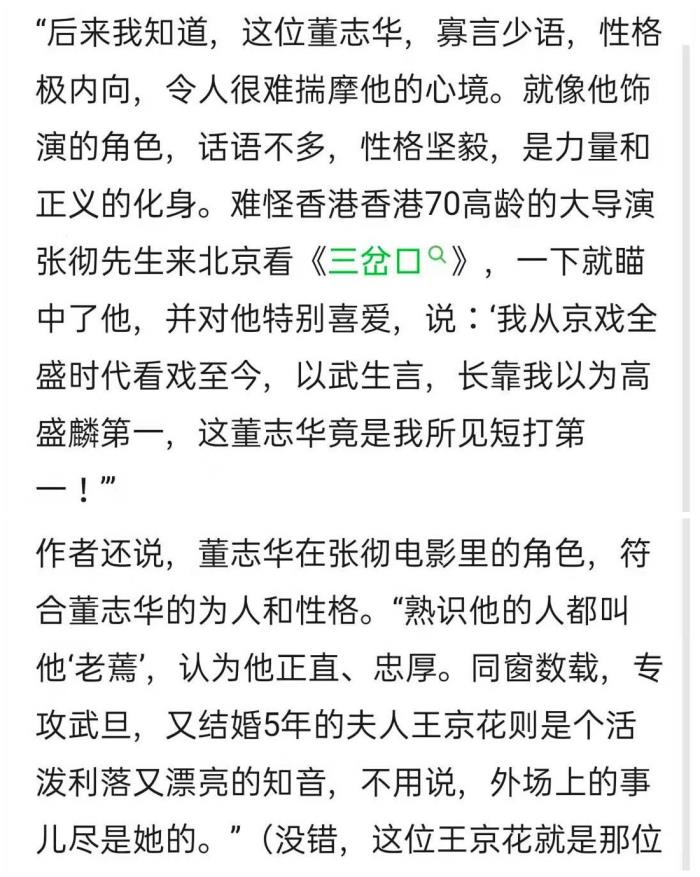 香港知名导演张彻看到董志华的《三岔口》,立时“爱”上了这个演任堂惠的年轻人,赞其是“所见短打第一”。