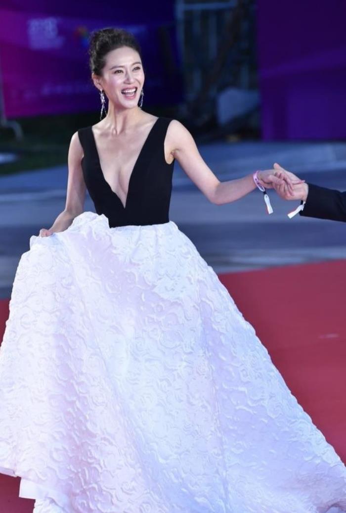 另一组照片中赵柯身穿了一条黑白长裙出现在大众的面前,这件黑白长裙整体素质单调的,它就以黑白色为主,上身是一件黑色的夸张的露V型的吊带。下身呢,是一条大长裙,下摆的长裙非常的宽阔,走在红毯上会有一种仙气飘飘的感觉,同时白色的裙摆上注重勾勒波浪细纹,让这件白色的大裙摆看起来更富有层次。但不得不说的是,这件服装最让人感到也移不开眼睛的是她的这件上身黑色露背吊带,夸张的把V领拉到了腰部,上半身的事业线展现了出来让人大饱眼福。