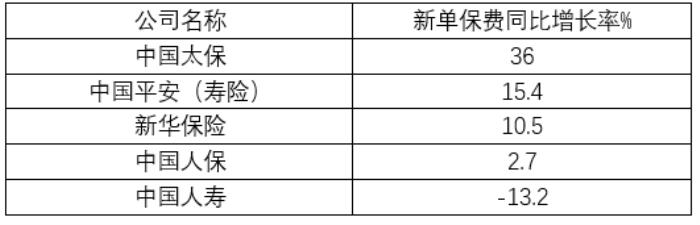 表四:五大上市寿险公司新单保费同比增幅排行榜