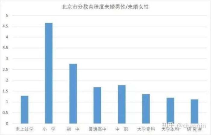 那么,是否“剩女”主要发生在教育水平较高的群体中呢?首先来看看北京市各教育程度上的未婚男女比。即使是在学历最高的研究生群体,未婚男性数量仍高出未婚女性11.2%。在低教育群体中,未婚人口的性别比失衡更为严重。比如,小学文化未婚男性大约是小学文化未婚女性的4.5倍。总的来说,无论是在发达地区还是在高教育群体中,数据都表明“剩男”要比“剩女”多。