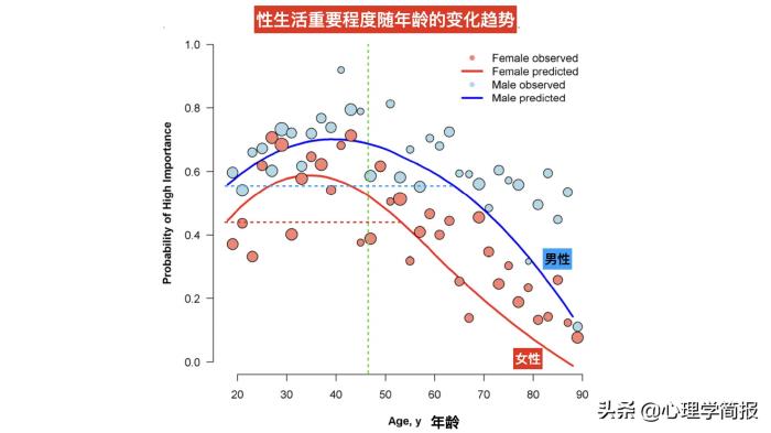 45岁之后,男女对“性”的认知分歧越来越大在这项研究中,威斯康星医学院的Kathryn E. Flynn教授等人对3515名年龄在18岁以上的成年人进行了心理学调查,重点深入研究了性生活对人们生活质量的重要程度在一生中的变化规律(数据如下图所示)[3]。