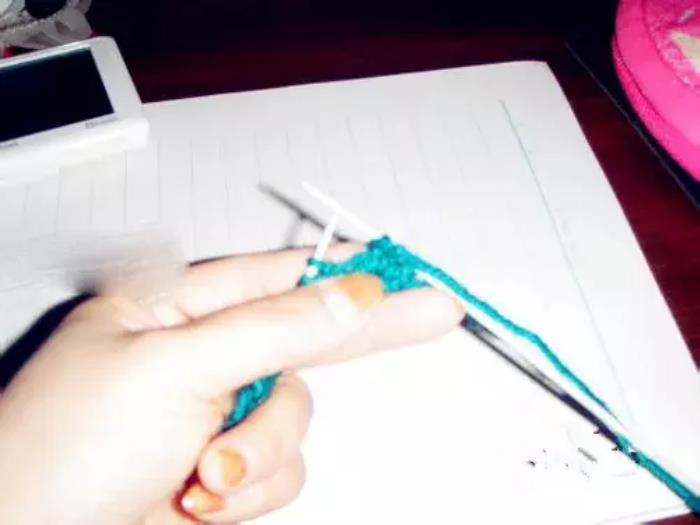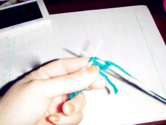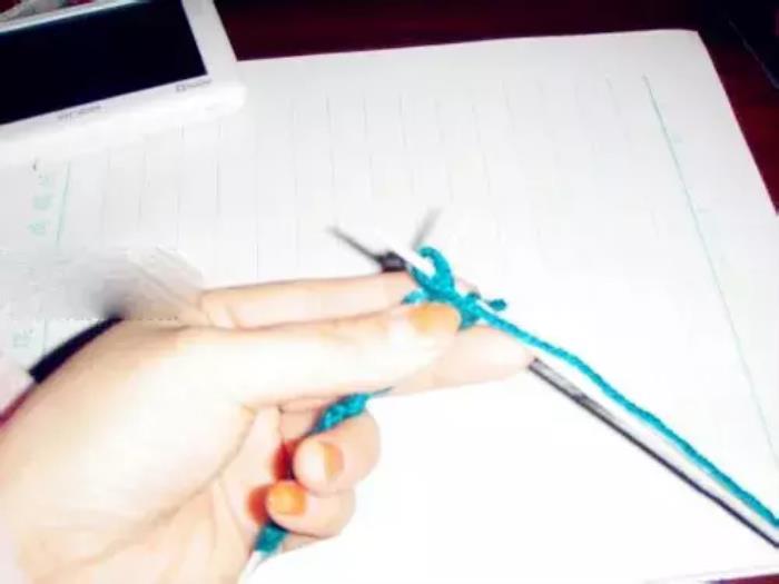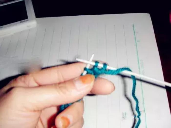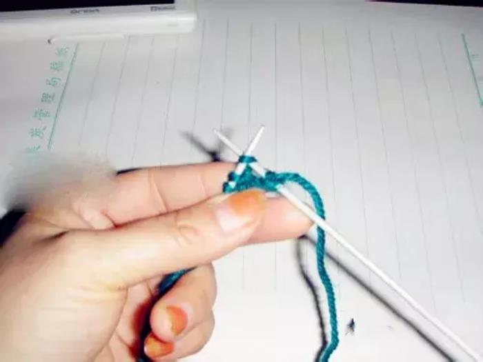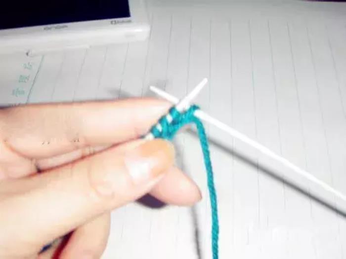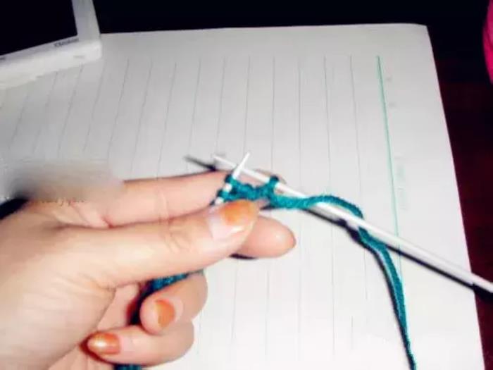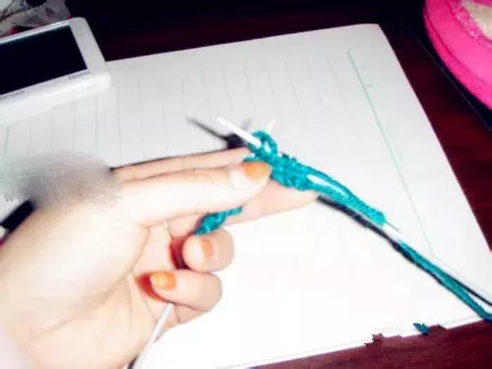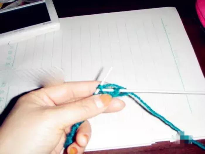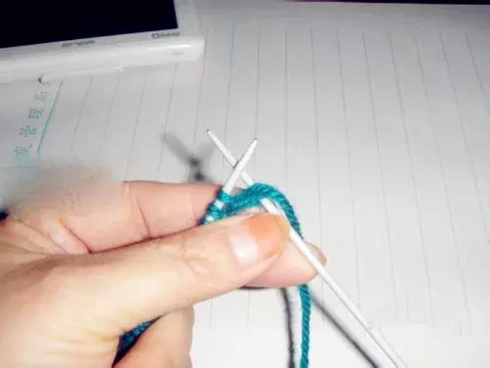 第三排和第一排织法相同。第一针,因为是边,挑在右针上不织,将线绕到上边;↓