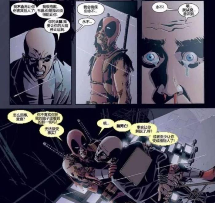 然后绿巨人出现,把死侍四分五裂,然后死侍利用自己的超变态恢复能力,在身体复原后不久的一个晚上,偷偷的到来了浩克所在休息的山洞里砍死了绿巨人。紧接着,死侍准备对付X战警,于是抓住了X教授,让他通过脑电波把全体战警召集了回来,教授没放在心上,因为在漫画开始的时候X战警轻易就抓住了死侍,然后没想到的是,死侍不仅用电击陷阱和凝胶炸弹秒杀了镭射眼等一众人,还让万磁王陷身在了特制凝胶酸当中,逐渐腐蚀消亡。博士震惊了,于是博士发大招了,侵入了死侍的脑子里,准备干掉死侍,然而教授遍历死侍的思想后,也知道了自己竟然是一个漫画人物,吓得教授七窍流血而亡。