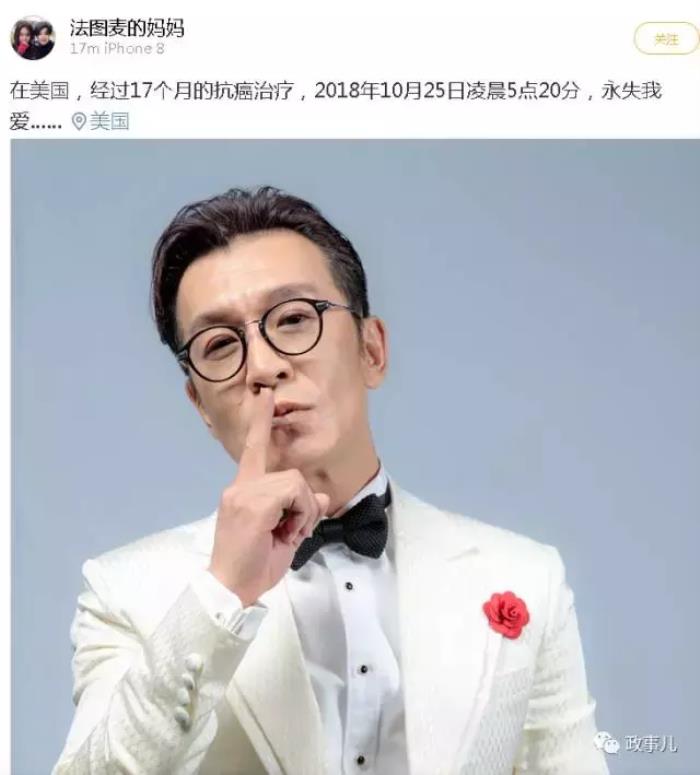 央视原主持人李咏因癌症在美国去世,妻子哈文发文:在美国,经过17个月的抗癌治疗,2018年10月25日凌晨5点20分,永失我爱。