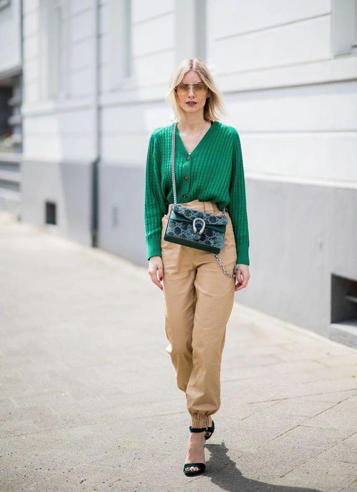 如果针织衫的面料够轻薄,不妨将衣摆略塞进裤腰内打造出高腰线,对整体比例的优化会更到位,而且造型的利落感也更足,或者直接选短款针织衫搭配高腰束脚裤,无需费力就能延长身线穿出高挑感,这身时尚街拍便是如此,绿色V领针织开衫搭配卡其色束脚裤清新又减龄,穿上高跟鞋更有女人味,天冷时还可以在内部叠穿高领打底衫层次感更丰富。